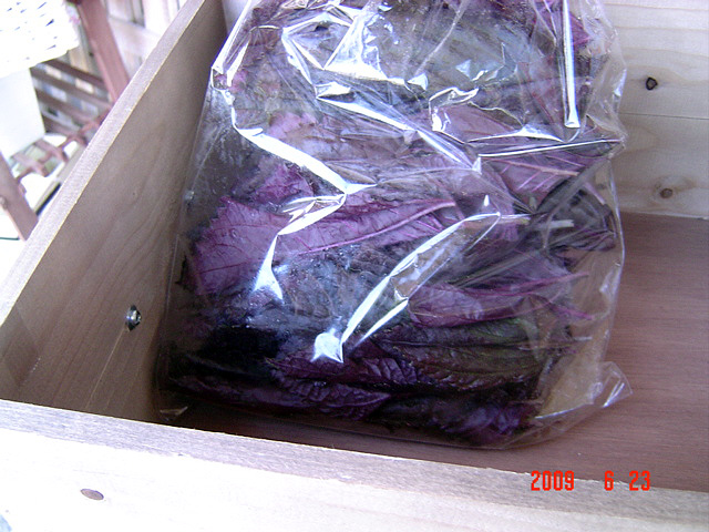 ②鍋に水(6カップ)を入れ、沸騰したら、シソを何回かに分けて入れ、強火にします。