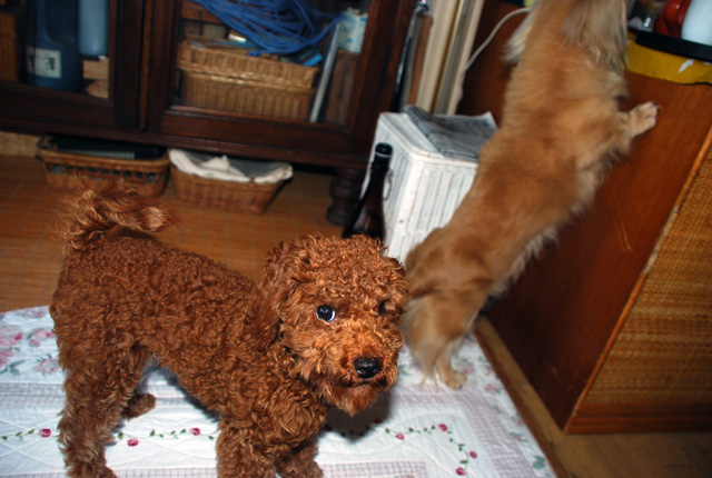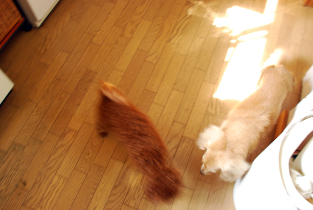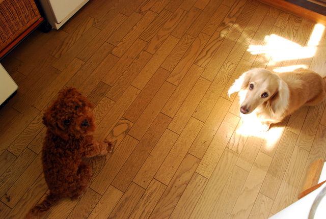 のそのそやってくるマイロと、ささ~とやってきて待っている小太郎